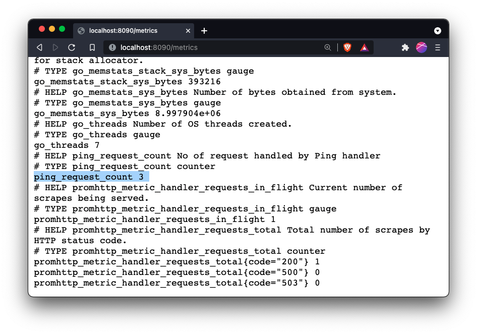 Now hit the localhost:8090/ping endpoint a couple of times and then send a request to localhost:8090/metrics to see the metrics.